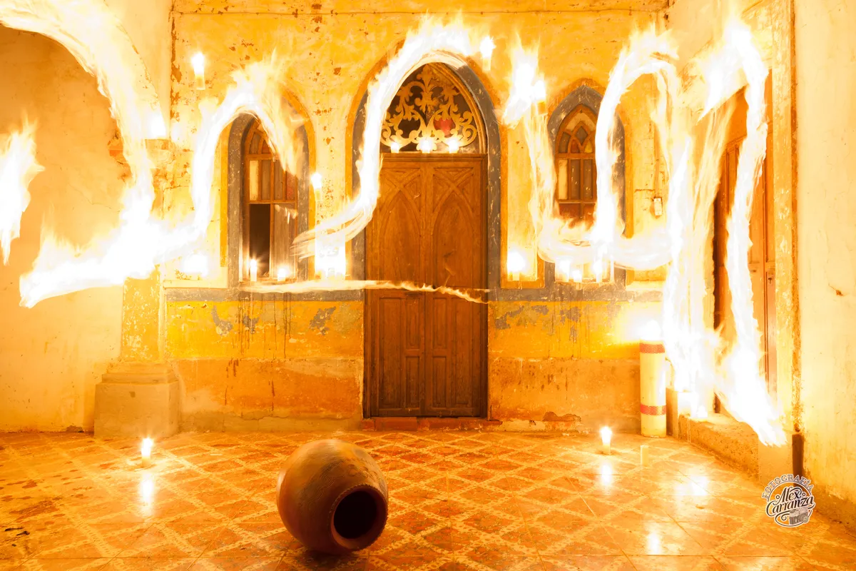 En una antigua casona llena de historia y misterio, llevé a cabo una sesión fotográfica para una candidata a reina representante del pueblo. Las paredes desgastadas y los arcos entre gótico y colonial del lugar fueron el escenario perfecto para crear una atmósfera única. Para darle un toque especial, se utilizó la técnica de light painting, donde las llamas de una antorcha trazaban figuras etéreas en el aire, creando una danza de luz y sombras. Mientras preparábamos la escena, con velas flotantes y elementos cuidadosamente dispuestos, algo inexplicable ocurrió. Uno de mis asistentes buscaba unas tijeras esenciales para terminar de colgar los alambres que sostendrían las velas. Por más que las buscábamos, revisando cada rincón, desde la alta escalera hasta las ventanas, las tijeras habían desaparecido sin dejar rastro. La búsqueda fue en vano, y decidimos seguir adelante con lo que teníamos. De repente, en medio del silencio, las tijeras aparecieron de la nada, cayendo al piso como si alguien las hubiera lanzado. Todos nos quedamos paralizados, mirándonos con incredulidad. No había explicación lógica. La energía del lugar parecía cobrar vida, envolviéndonos en un aura de misterio. A pesar del desconcierto, continuamos con la sesión, y logré capturar gracias también a mis compañeros esta imagen, que refleja no solo la belleza de la escena, sino también el enigma que la rodeó. Una foto que, más allá de su técnica y composición, guarda una historia que nos dejó marcados a todos los que estuvimos ahí. Si deseas llevar contigo esta obra única, no solo estarás adquiriendo una fotografía artística, sino también una pieza llena de misterio e historia que atrapará las miradas y despertará la imaginación de quien la contemple. Ideal para decorar espacios con un toque de arte y narrativa, esta imagen puede ser tuya en una edición personalizada. Alex Carranza