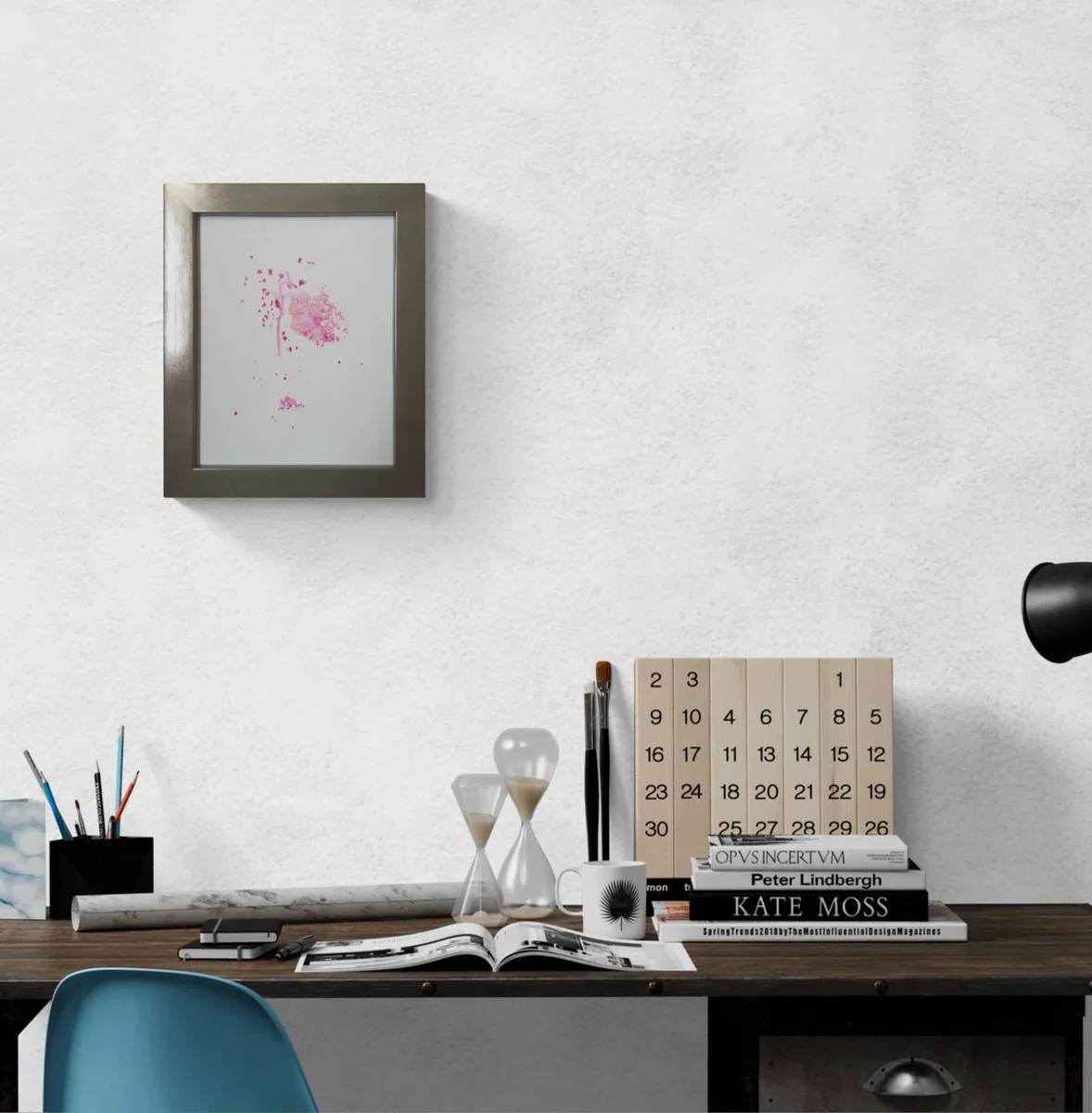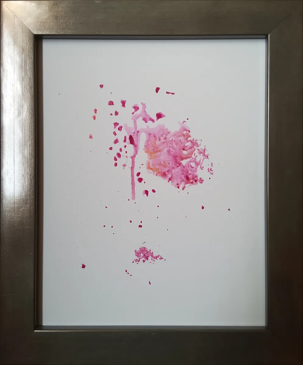 Random stains created as by-product of a bigger acrylic Indian ink work. Wood frame with palladium finish.