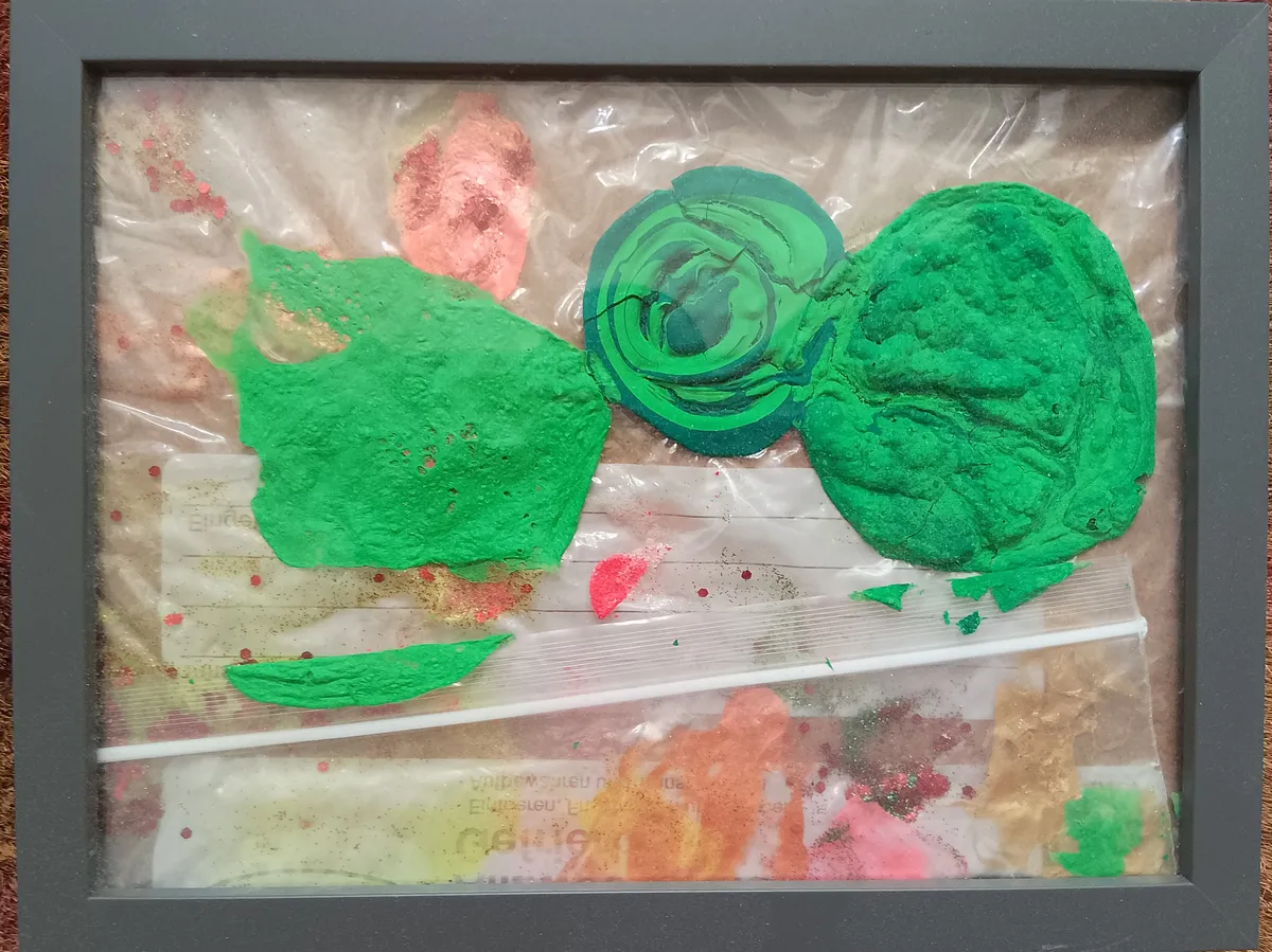 Currently on hold: A round-up of experiments in summer 2022 on a zipper freezer bag, wooden frame, 99% art glass.